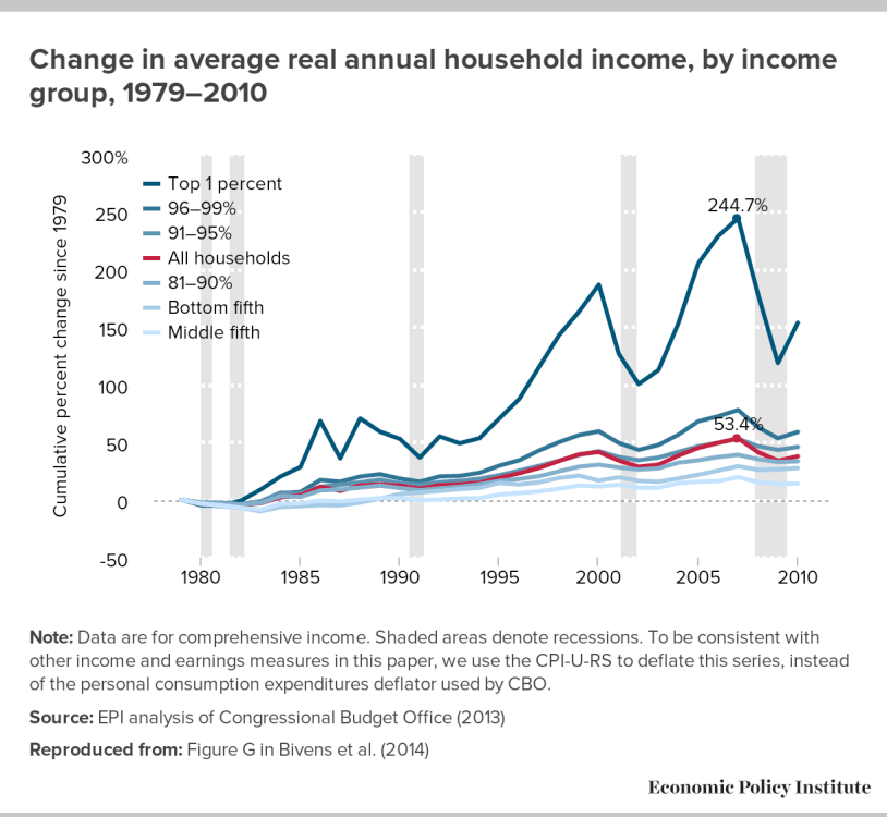 During periods of high rate increases and recessions, inequality greatly increases. The 1% get richer and richer, while those at lower income levels lose household wealth.