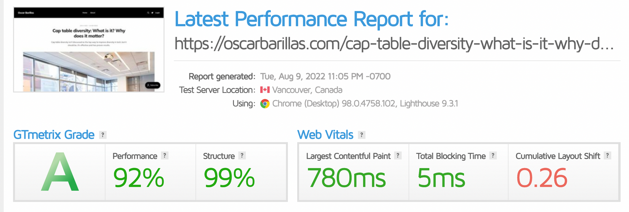 Ghost is quick! Even on my image-intensive posts, it easily scores an A on GTMetrix. GTMetrix helps analyze website speed; on every page, my Ghost website scores an A.