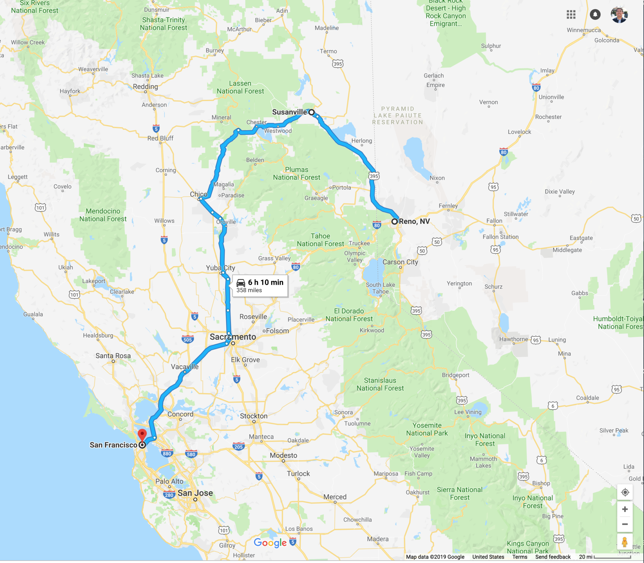 The overall goal of this route is to go around Lake Tahoe and cut across through the North. You can cross at either Susanville or Adan. You would start this route from Reno, Nevada.